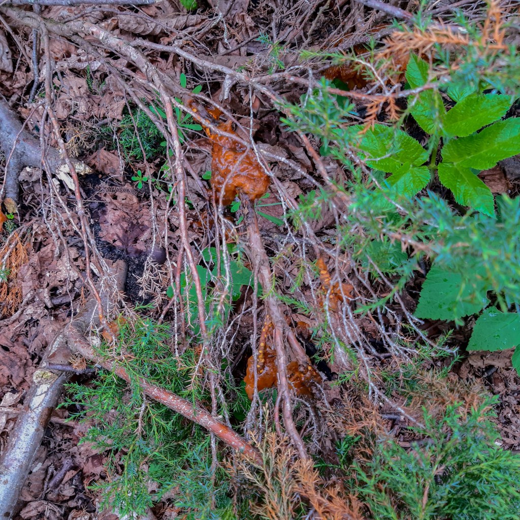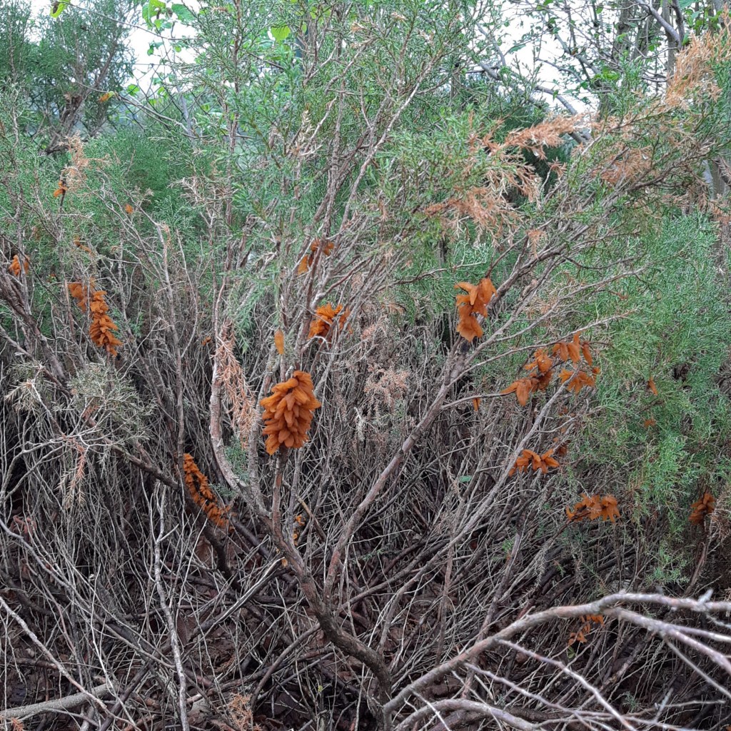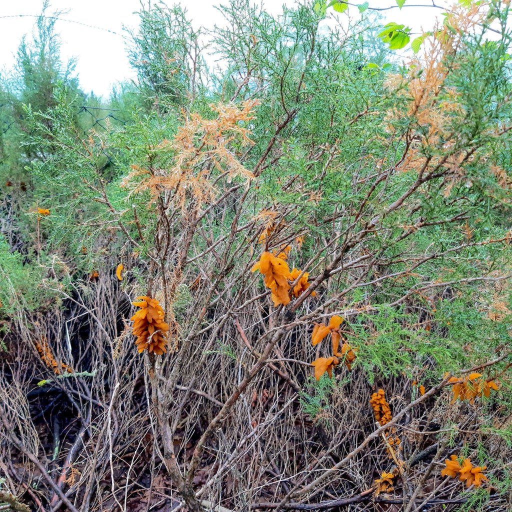 Bei feuchtem Wetterr Anfang Mai konnten wir die galertartigen Auswüchse an unseren alten Wacholdersträuchern sehen. Eine Woche später waren Sie schon wieder eingetrocknet und kaum noch zu erkennnen.
