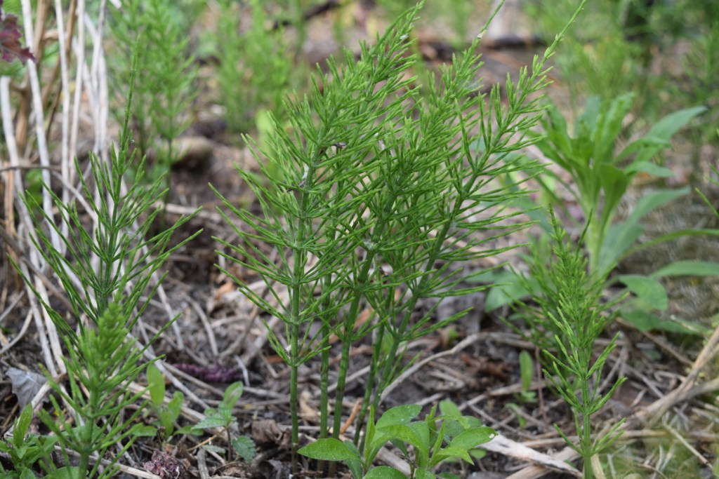 Jedes Jahr im späten Frühjahr „explodiert“ der Ackerschachtelhalm mehr oder weniger, je nach Wetterlage. Wir lassen das Kraut gern etwas auswachsen, dann lässt es sich leichter zupfen. Wir hacken unsere Beete nicht.
