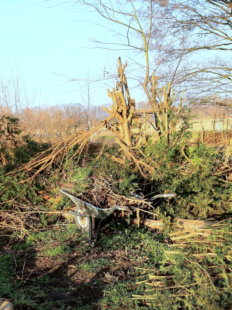 Durch schrittweises, gezieltes Beschneiden von unten nach oben wollten wir die Eibe verjüngen. Mit Bedacht nahmen wir unsere Astschere und begannen mit den ersten Schnitten. Trockene und unnötige Äste entfernten wir behutsam und der Baum erwachte schnell zu neuem Leben.