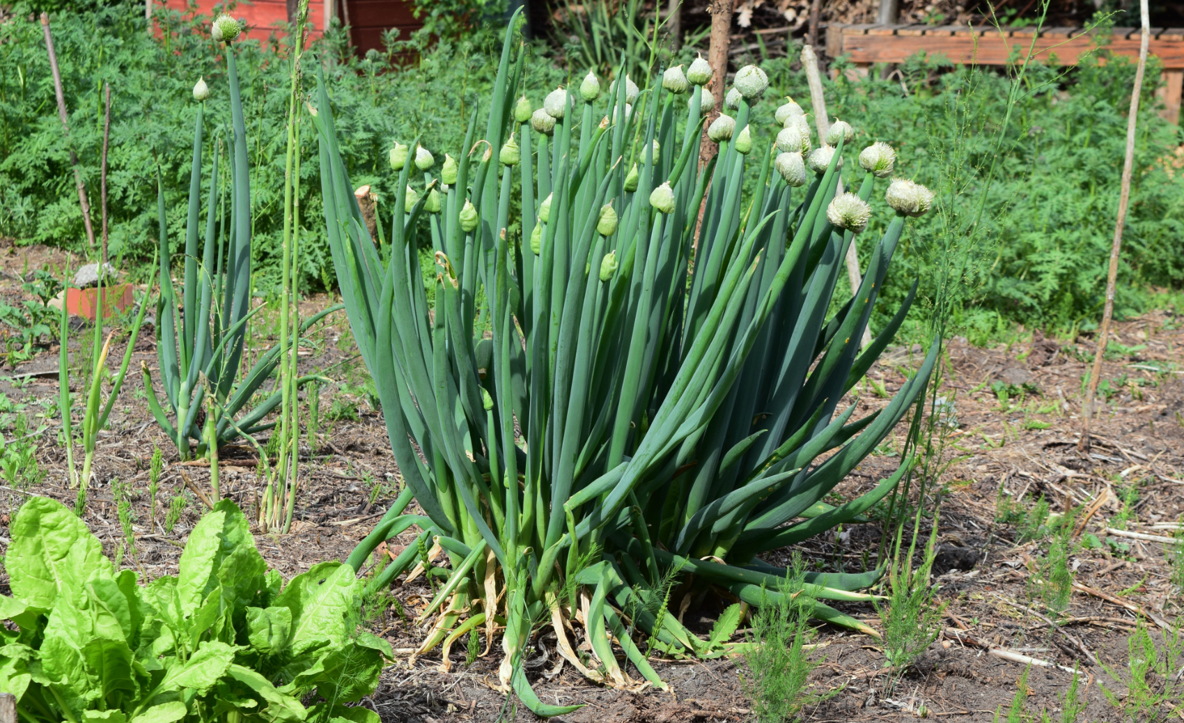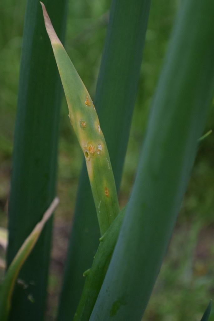 Auch bei uns ist die Winterheckzwiebel nicht immun gegen Krankheiten. Im Mai 2023 hatte Sie Rost (Puccinia porri) eine verbreitete Pilzkrankheit. Die Infektion war nicht schwerwiegend. Zu dieser Zeit begannen 2023 die Blüten zu sprieße und wir haben eine Erntepause eingelegt.